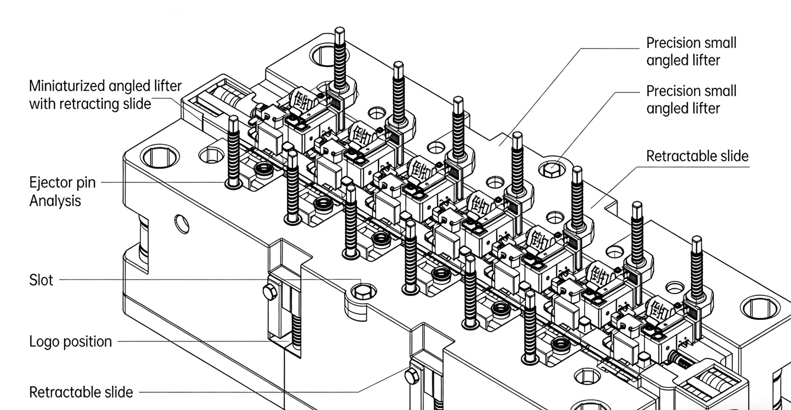 Thách thức: Bên trong có các chốt ngăn chứa pin dày đặc, các chốt định vị PCB và cơ cấu khe trang trí, tạo ra các cấu trúc phức tạp dễ bị vết chớp, biến dạng hoặc trầy xước trong quá trình tháo khuôn. Giải pháp: Thiết kế cơ cấu kết hợp “bộ đẩy vi côn đa nhóm và thanh trượt thu vào”. Đầu phun siêu nhỏ có độ chính xác nhỏ gọn xử lý các đường gờ và đường gân dày đặc bên trong. Đối với các khe bên hoặc vị trí logo, các thanh trượt có thể thu vào đảm bảo quá trình phóng ra trơn tru mà không làm hỏng sản phẩm. Bố trí chốt đẩy trải qua quá trình phân tích ứng suất để đảm bảo quá trình phóng ra trơn tru, cân bằng.